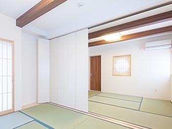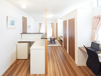 耐震ダンパーの設置、シャッターや格子を設置、警備会社の防犯システムも導入しました。1階和室は客間兼集会室、カウンターキッチンでおもてなし、2階リビングはバーコーナーもあり、富士山を眺めながらゆったりくつろげる空間が広がっています。